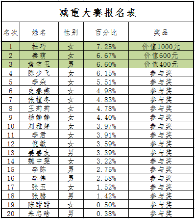 此次减重大赛共计22人参加。在比赛期间,参赛者从无肉不欢变成只吃水煮菜;从餐餐碳酸饮料变成每天2000ml白开水;从只要能躺着就绝不坐着变成每天步行上下班... ...在经历一个月的痛苦角逐后,此次减重大赛最终评选出前三名!